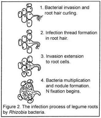 Rhizobial cells in the soil are first stimulated to divide by compounds released by the roots of the potential host plant. These motile cells contact and attach reversibly to root hairs of plants such as alfalfa peas or other legumes. There is a high degree of specificity between the species of bacteria and the host plant mediated by specificity genes. Only infection by certain species can cause the formation of “effective” nodules capable of nitrogen fixation.