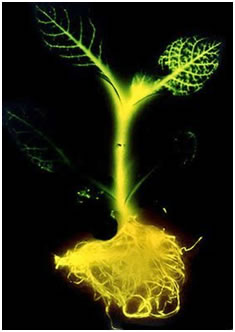 In this image, for example, we see a tobacco plant into which has been transplanted the gene for the production of fire fly luciferase, the enzyme responsible for bioluminescence. The firefly gene was imbedded in the Ti plasmid and then the plasmid was introduced into the plant by infection with Agrobacterium. The result, a glow in the dark tobacco plant.